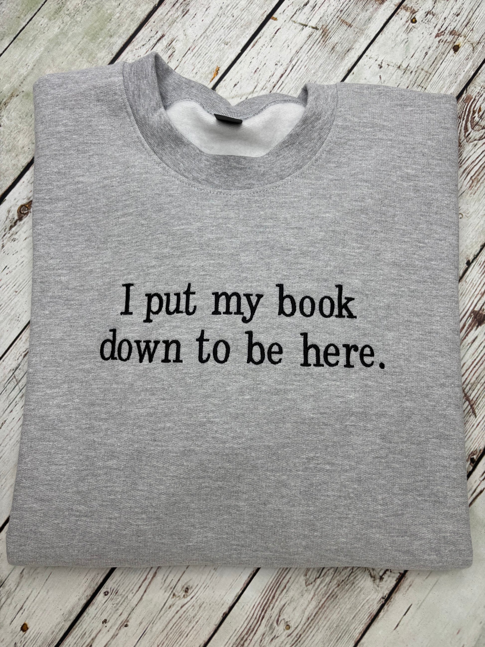 Soft, cozy, and made for book lovers. This sweatshirt features the phrase “I put my book down to be here,” a relatable statement for anyone who would rather be reading. Perfect for everyday wear, lounging, or gifting to your favorite reader.